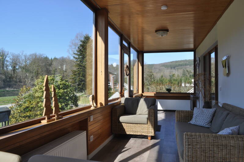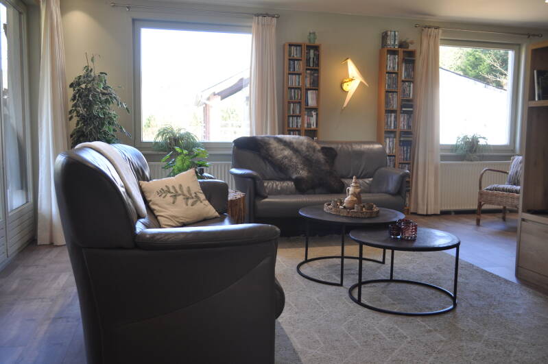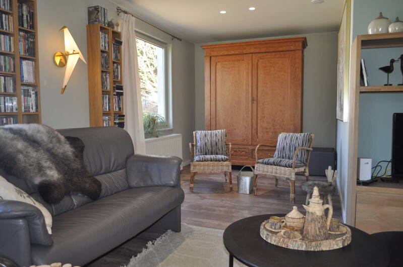 Ruime woonkamer met lederen salon, leeshoek, WIFI, Tv met DVD-speler, uitgebreide collectie DVD's ter beschikking, radio/cd speler met grote collectie cd's,