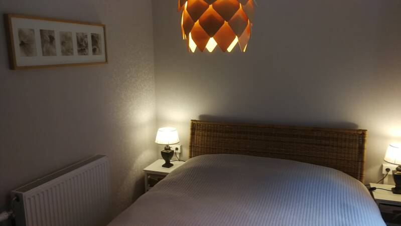 Gelijkvloerse slaapkamer naast de woonkamer met dubbel bed 160 cm